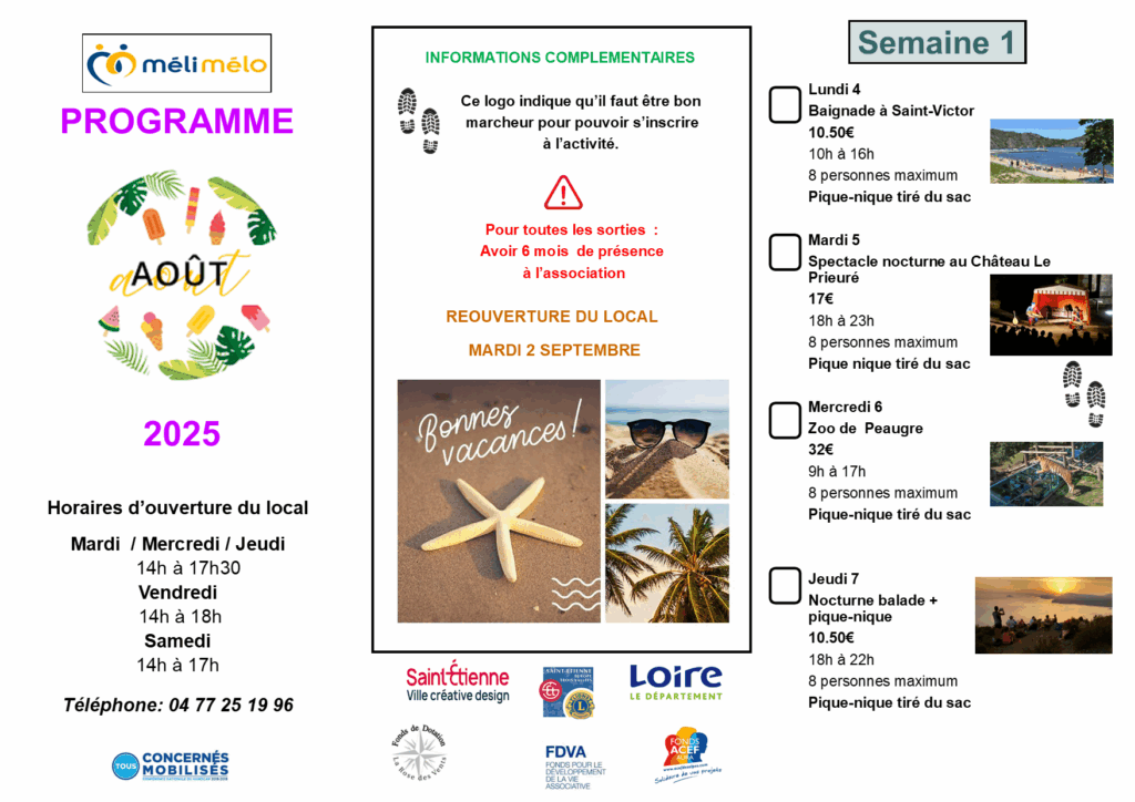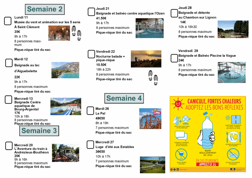 Inscriptions sur place jusqu’au 30 juillet selon les places disponibles (8 par sortie) à régler en juillet.