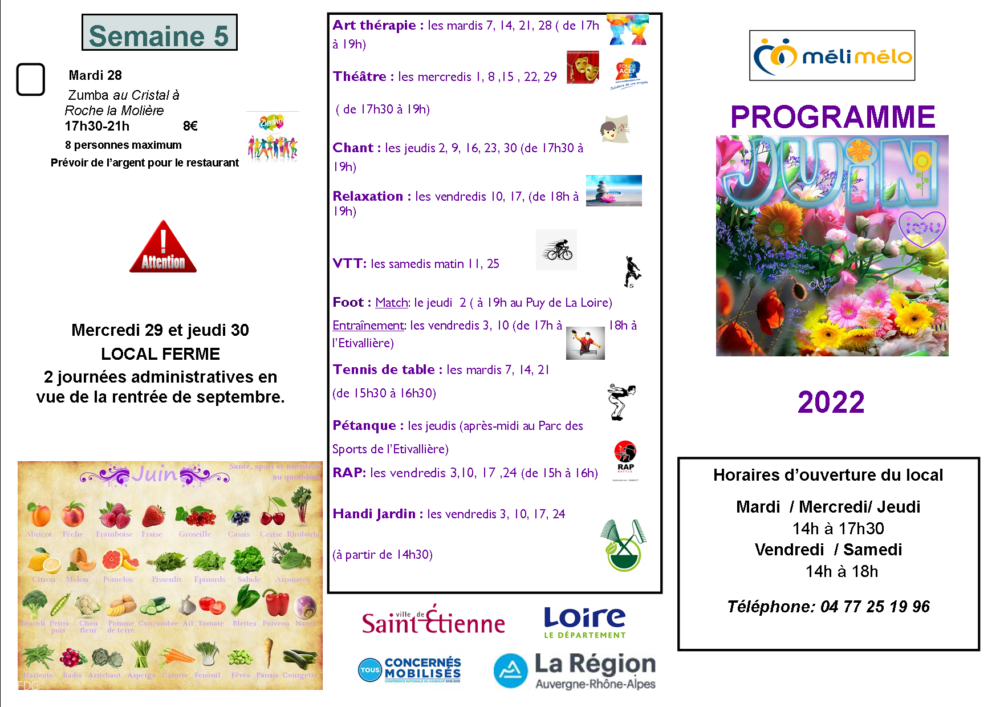En Juin, à Méli-Mélo, l’été commence dès les premiers jours : pétanque en plein air et pique-nique, 2 spectacles à la Comédie, spectacle de Voltige avec Les 7 Collines, balades, atelier Bois, massages, café philo, Restaurant, repas partagé…