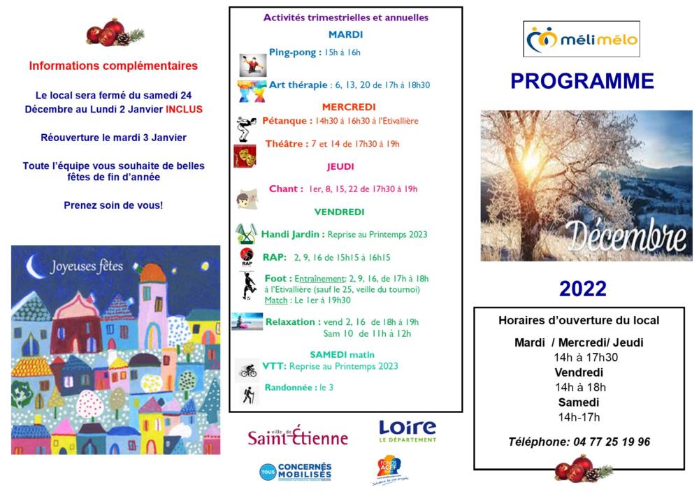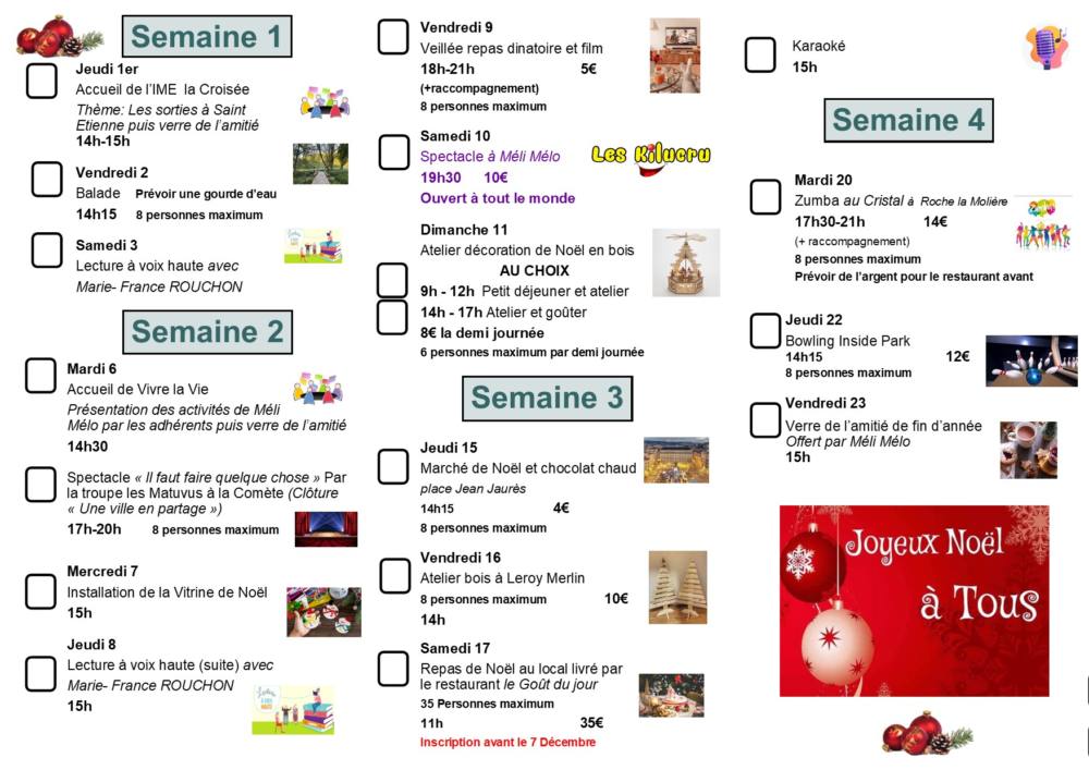 Veillée film et dîner, Lectures et accueil de futurs adhérents, Ateliers de déco de NOEL avec Petit-Déjeuner ou Goûter au choix, Installation de la vitrine de Noël, Promenade au Marché de Noël… un délicieux Repas de Noël se déroulera au local livré par un restaurateur stéphanois (sur réservation) ; autre bonne nouvelle : la troupe Kilucru nous fait l’honneur de venir jouer au local !