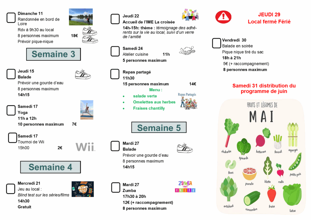 Voici le programme de Mai ! Découvrez-le ou faites-le découvrir aux personnes que vous accompagnez. Les inscriptions* se font sur place, en présence d’un animateur de Méli-mélo qui vérifie les disponibilités.