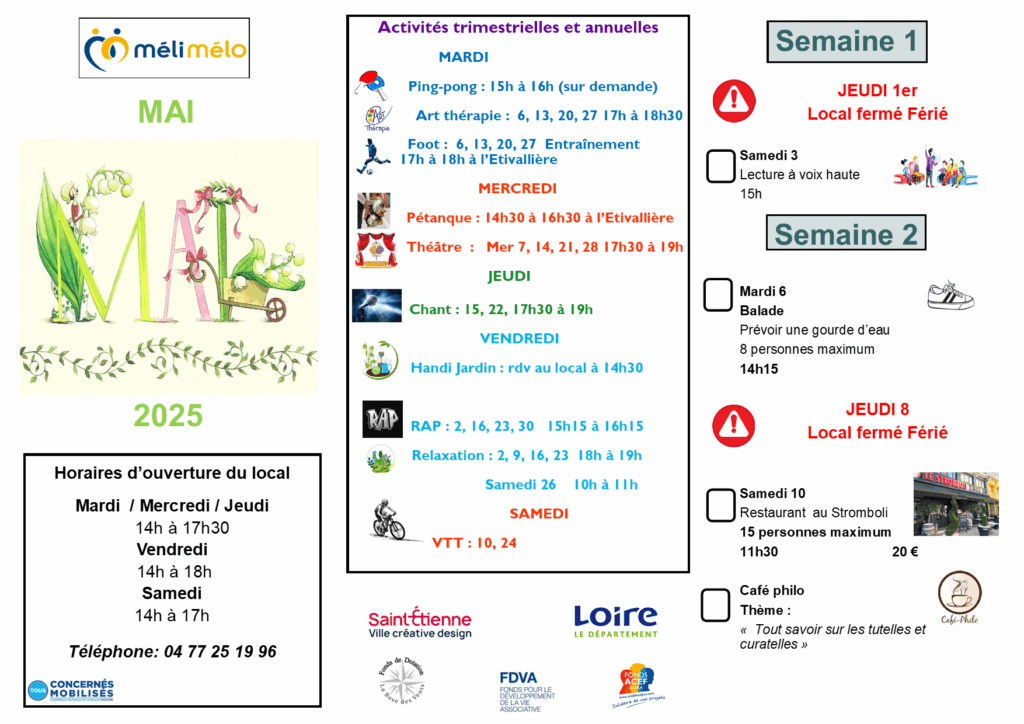 Voici le programme de Mai ! Découvrez-le ou faites-le découvrir aux personnes que vous accompagnez. Les inscriptions* se font sur place, en présence d’un animateur de Méli-mélo qui vérifie les disponibilités.