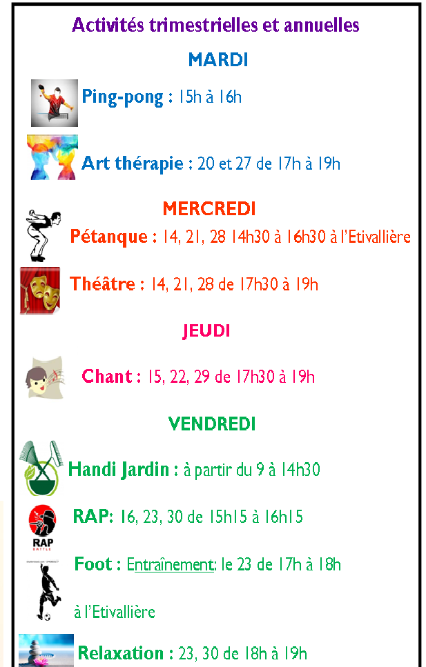 - Activités trimestrielles (Art thérapie, Rap, Relaxation) : à partir du 6 septembre ( formulaire à retirer sur place)
